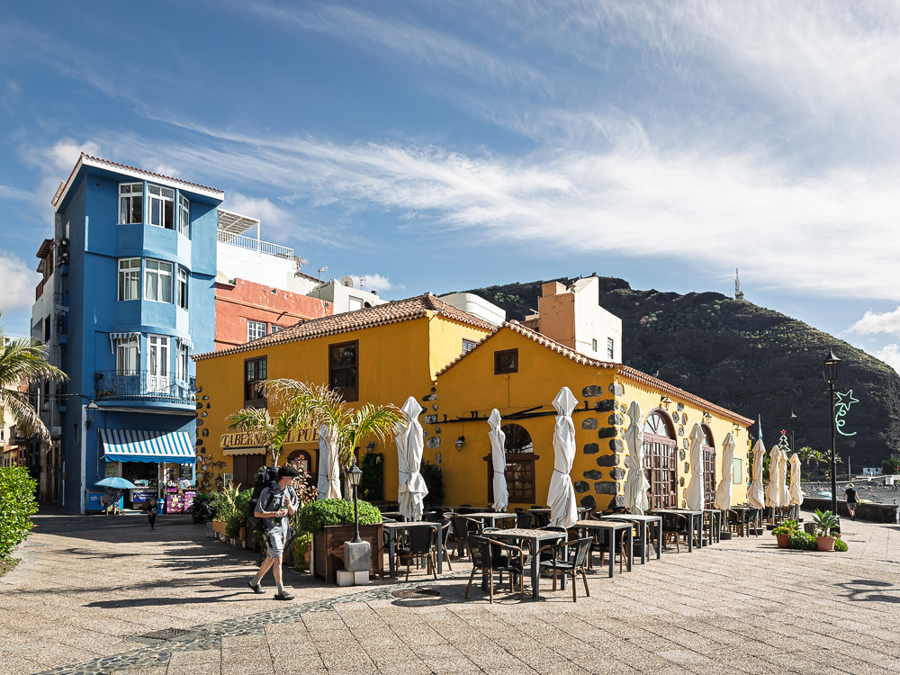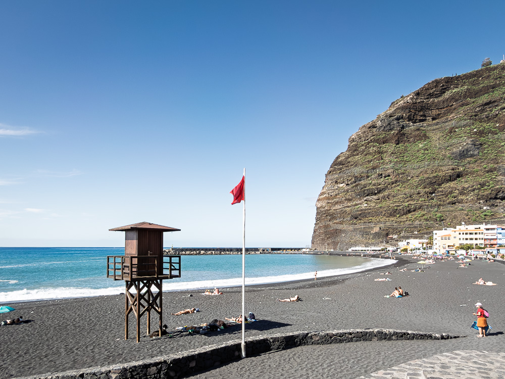 Zwischen den hohen Steilwänden erstreckt sich eine mit schwarzem Lavasand aufgeschüttete und durch Wellenbrecher geschützte Badebucht. Dieser Strand gilt als einer der schönsten der Insel. Darüber hinaus entpuppt sich Puerto de Tazacorte als ein beschauliches und überschaubares Strandörtchen. Ein paar Häuser, kleine, stille Gassen, lauschige Restaurants an der Strandpromenade.